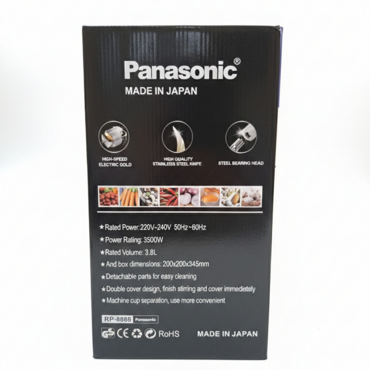 توان به کار رفته در خرد کن حداکثر 3500 وات از نوع مکس پاور (قدرت بسیار بالا) است.خردکن پاناسونیک دارای 4 تیغه بسیار تیز می باشد، جنس تیغه ها استیل ضد زنگ می باشد که امکان خرد کردن گوشت ، سبزیجات-پیاز- سیب زمینی و ....را به راحتی و در مدت زمان کوتاه برای مصرف کننده فراهم میکند. از نکات قابل توجه خردکن پاناسونیک که عمر طولانی مدت دستگاه را تظمین می کند خاموشی خودکار در حالت کارایی بسیار بالا و داغ شدن موتور است که پس از سرد شدن دستگاه آماده به کار مجدد می شود